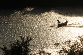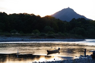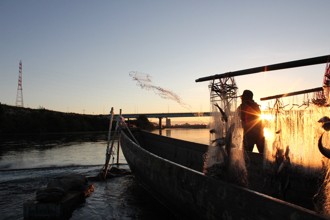 / 人,帽子,サングラス,船,網,魚,鮎,アユ,カゴ,岩石,橋,建物,植物,河畔植生,空,夕焼け,川,鉄塔,電線
