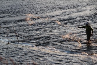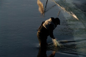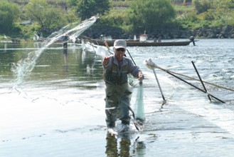/ 人,帽子,胴長,たばこ,網,魚,船,笠,エンジン,消波ブロック,植物,河畔植生,木