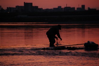 / 人,網,川,水面,堤防,建物,空,夕焼け