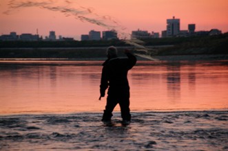 / 人,川,帽子,網,建物,夕焼け,水面,空