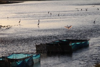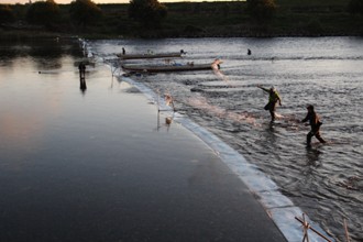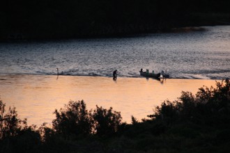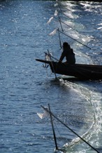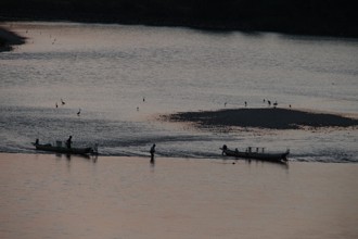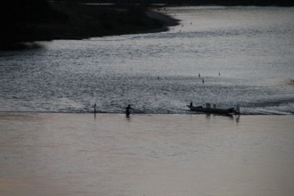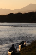 / 人,船,川,エンジン,網,鳥,鷺,サギ,河原,帽子