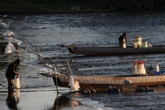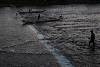 / 川,人,帽子,胴長,船,網,エンジン,植物,木,河畔植生