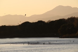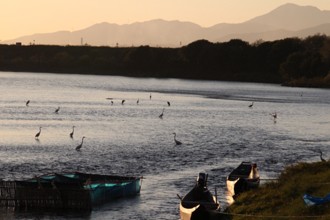 / 鳥,鷺,サギ,川,植物,河畔植生,山,道路標識,電柱,電線,空,夕焼け,船,エンジン