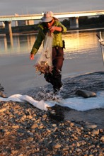 / 人,胴長,帽子,網,サングラス,川,橋,外灯,堤防,建物,河原,岩石,魚,植物,河畔植生