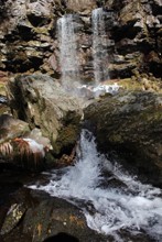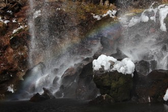 / 川,岩石,植物,河畔植生,虹,雪,水しぶき