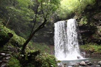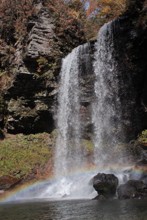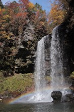 / 川,岩石,植物,河畔植生,青空,紅葉,滝,虹,森林,木
