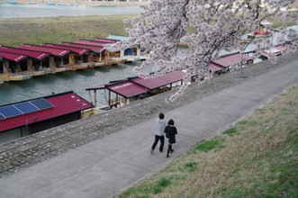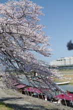 / 桜,船,建物,橋,川,植物,河畔植生,空,木