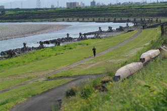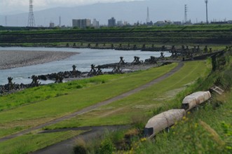 / 人,川,船,植物,岩石,建物,鉄塔,橋,堤防,街灯
