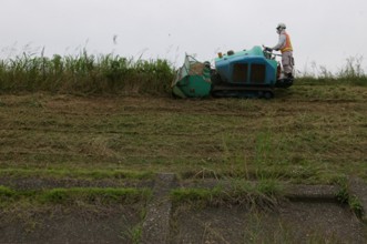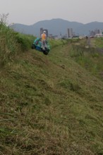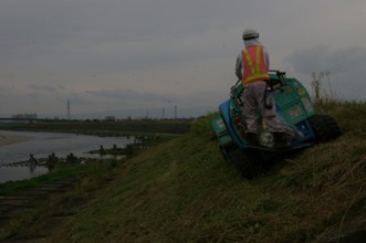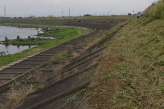 / 人,ヘルメット,川,植物,河畔植生,堤防,空,建物,消火器