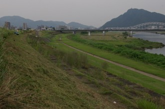 / 川,空,標識,植物,河畔植生,鉄塔,建物,車,岩石,人,堤防