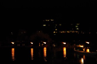 / 川,夜,人,船,火,建物