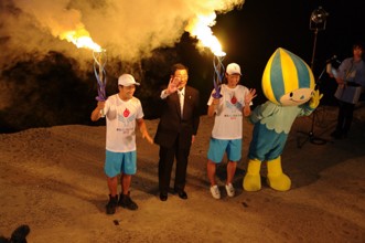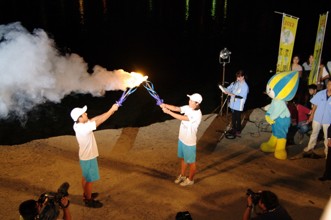 / 人,帽子,旗,マイク,カメラ,川,夜,ミナモ,着ぐるみ,子供,火