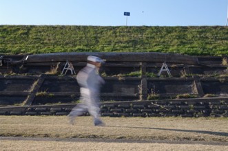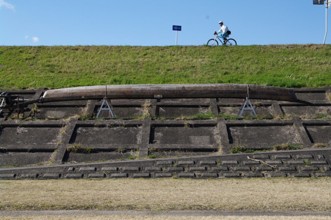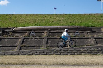 / 人,ヘルメット,堤防,標識,空,船,植物,眼鏡,手袋,ペットボトル,鞄,自転車