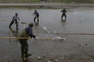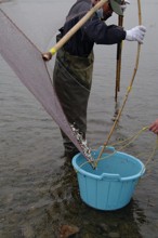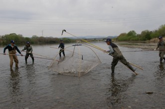 / 人,網,魚,胴長,川,マスク,植物,河畔植生,手袋,消波ブロック