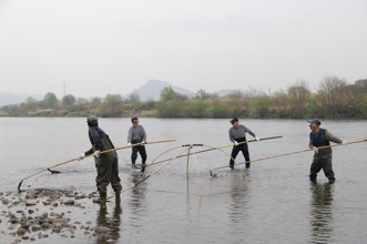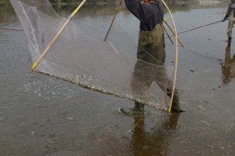 / 人,籠,マスク,魚,網,手袋,川,岩石