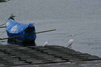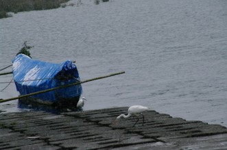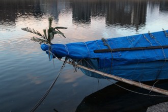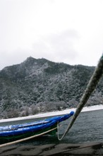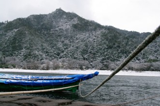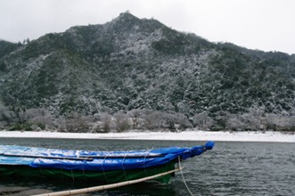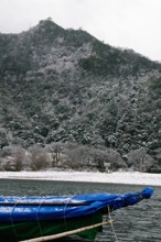 / 船,雪,川,山,植物,木,河畔植生,建物,縄