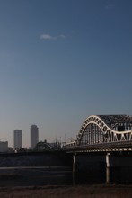 / 橋,川,植物,建物,車,信号機,街灯,木,河畔植生,標識