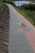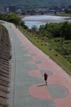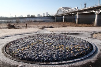 / 人,花,橋,歩道橋,植物,木,河畔植生,街灯,建物,標識,信号機