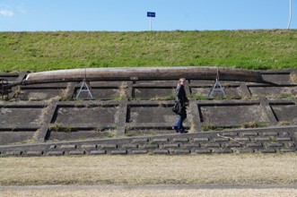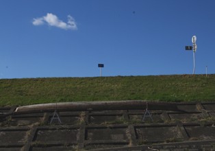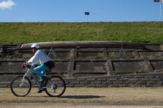/ 人,ヘルメット,堤防,標識,空,船,植物,眼鏡,手袋,ペットボトル,鞄,自転車