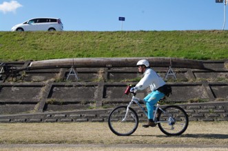 / 人,ヘルメット,車,堤防,標識,空,船,植物,眼鏡,手袋,ペットボトル,鞄,自転車