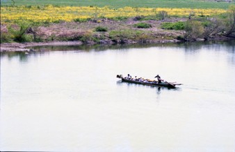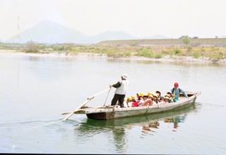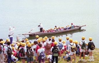 小紅の渡し・遠足 / 人,舟,帽子,子供,小学生,川,植物,河畔植生,菜の花,建物,水筒