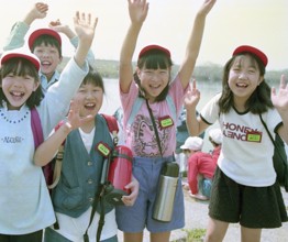 / 人,小学生,子供,帽子,笑顔,水筒,植物,川,名札,河畔植生