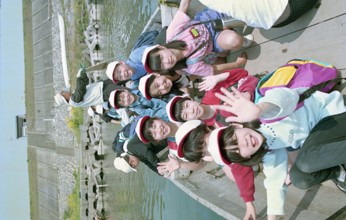 / 人,舟,帽子,子供,小学生,川,植物,河畔植生,菜の花,浮き輪,鞄