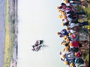 小紅の渡し・遠足 / 人,舟,帽子,子供,小学生,川,植物,河畔植生,菜の花,浮き輪,鞄