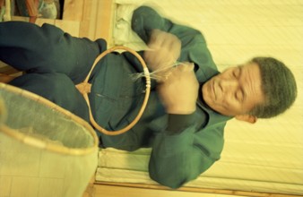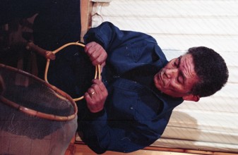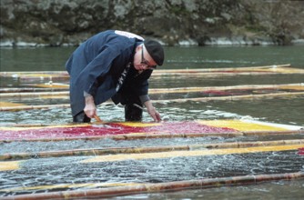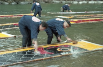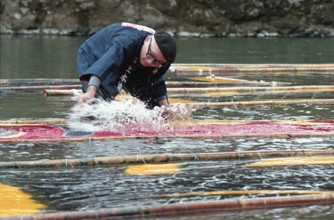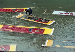 寒ざらし(渡辺庄吉氏) / 人,鯉のぼり,眼鏡,川,しぶき,法被,帽子