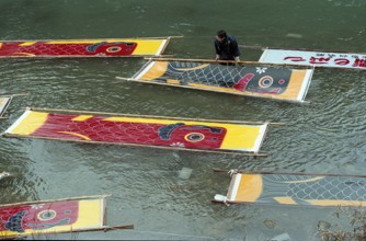 / 人,鯉のぼり,眼鏡,川,しぶき,法被,帽子