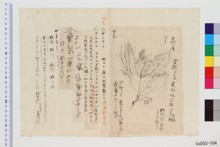 山果■/夏至後ニ開ク、蕾紅色、開ケバ白シ、葉味微苦/十三/{十二、朱書}、棠梨皮(ヤマナシノカハ)〈那須郡高久村〉産、{十年博覧――(会解説)、朱書}、採収、棠梨ハ四月ノ頃花ヲ開キ、花謝シテ実ヲ結ヒ、十月ノ頃ニ熟ス、味尤渋酸ナリ、六月ヨリ八月ノ間ニ於テ木ヲ二三尺ノ長サニ伐リ、木槌ニテ之ヲ打チ皮ヲ剥キ取リテ日ニ乾シ、然ル後細(コマカ)ニ之ヲ砕(クダ)キ水ヲ加ヘテ一煎シ、之ニ明礬鉄漿等ヲ調和スレハ茶色ノ染料トナル、棠梨皮〈美濃国字白谷〉産、{十年博―――(覧会解説)、朱書}、採収、渓谷ノ間ニ自生ス、五月ノ頃花ヲ開ク、白色五弁林檎花ニ似テ小シ、花後実ヲ結フ、形桜子ノ如シ、十月ノ頃紅熟ス、凡五十年ヲ経テ囲三四尺ナルモノヲ揀ヒ、六七月中ニソノ樹皮ヲ剥取リ、乾貯シテ染料ニ用フ、染匠此皮ヲ用ヒテ黄色或ハ月色ヲ染シテ出スト云フ/無風楊柳漫天祭不雨海棠(ヤマナシ)海北花、宋ノ范成大ノ句、【絶句類選 六ノ十六丁】