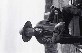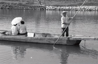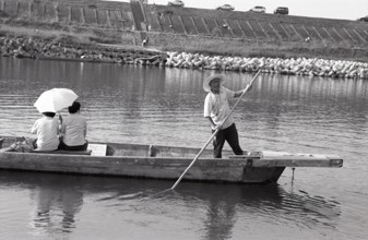 小紅の渡し(棚瀬正巳氏) / 人,舟,帽子,河畔植生,川,竹