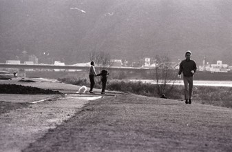河畔の朝 / 人,犬,木,植物,橋,建物,山