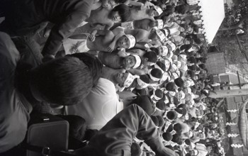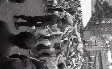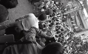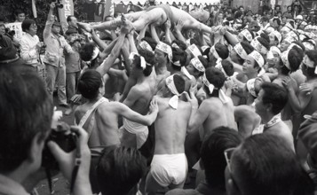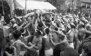 裸祭りクライマックス / はちまき,裸,祭り,神社,ふんどし,建物,鳥居,鞄,帽子,木,胴上げ,カメラ,裸足,人,フィルム,屋台,旗