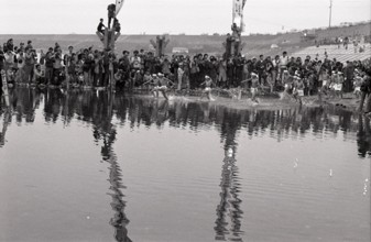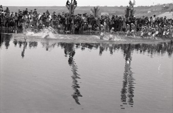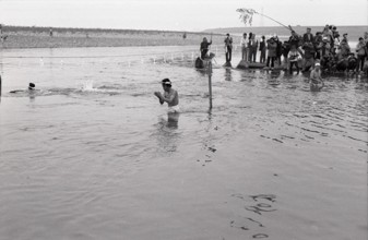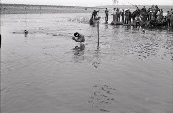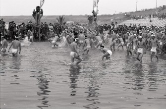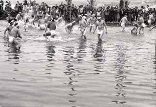 / 寒中水泳,裸,褌,はちまき,人,柱,水しぶき,堤防,車,カメラ,ふんどし