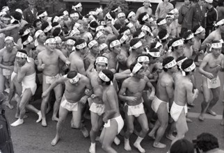 / 寒中水泳,裸,褌,はちまき,人,紙垂,祈り,川,祭り,ふんどし,カメラ,船,竹,合掌