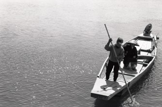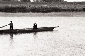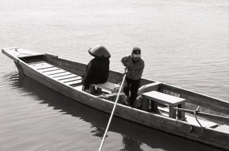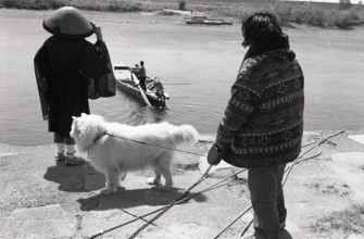 / 船,川,犬,僧侶,人,河畔植生,水面,笠,和服,着物,エンジン,靴,履物,ロープ