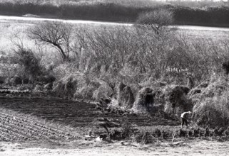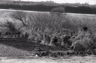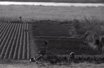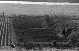 / 畑,木,植物,河畔植生,人,鍬,農家,農業,川,水,農具