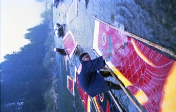 鯉のぼり寒ざらし / 川,鯉のぼり,岩石,植物,人,帽子,雪,法被,橋,眼鏡,竹,刷毛
