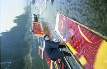 / 人,裸,子供,はちまき,ふんどし,脚立,川,しぶき,帽子