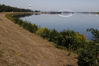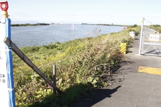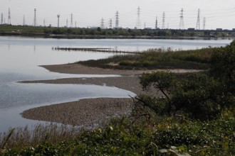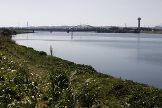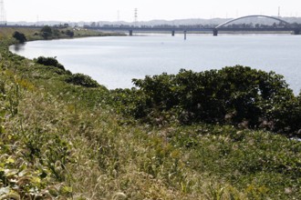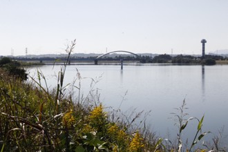 / 川,河川植生,鉄塔,電線,空,雲,橋,車,トラック,建物,植物