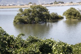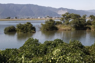 / 川,山,植物,河畔植生,木,建物,空,堤防