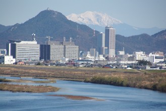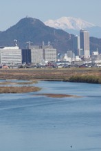 / 山,金華山,岐阜城,鉄塔,建物,電柱,電線,アンテナ,空,川,植物,河畔植生