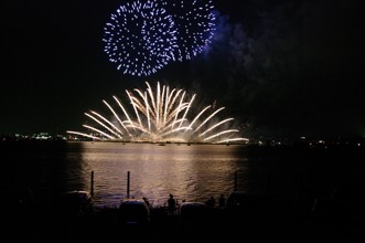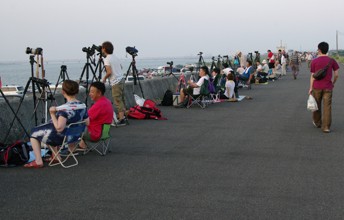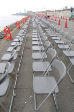 / 椅子,三角コーン,提灯,建物,川,人,ヘルメット,植物