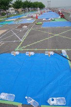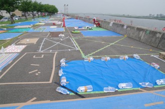 / 人,三角コーン,ペットボトル,ブルーシート,木,植物,車,建物,帽子,岩石,川,橋,椅子