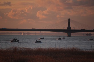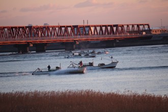 / 橋,植物,空,建物,人,船,胴長,街灯