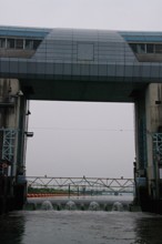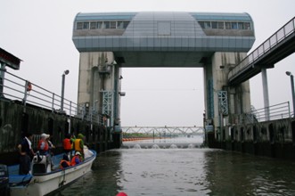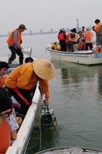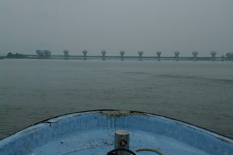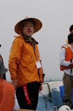 / 船,笠,川,帽子,眼鏡,救命胴衣,橋,カメラ,建物,腕時計