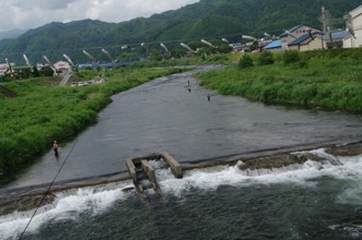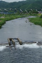 / 川,岩石,植物,河畔植生,木,橋,山,空,雲,建物,電柱,車,人,堤防,帽子,網,釣り竿