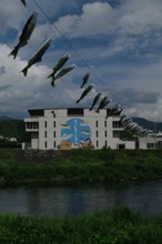 / 川,植物,こいのぼり,建物,河畔植生,岩石,鉄塔,山,空,雲