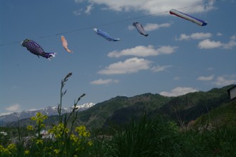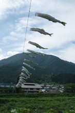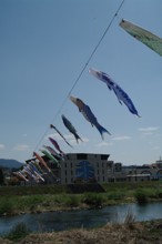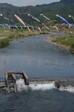 / 川,岩石,植物,河畔植生,こいのぼり,橋,木,花,山,空
